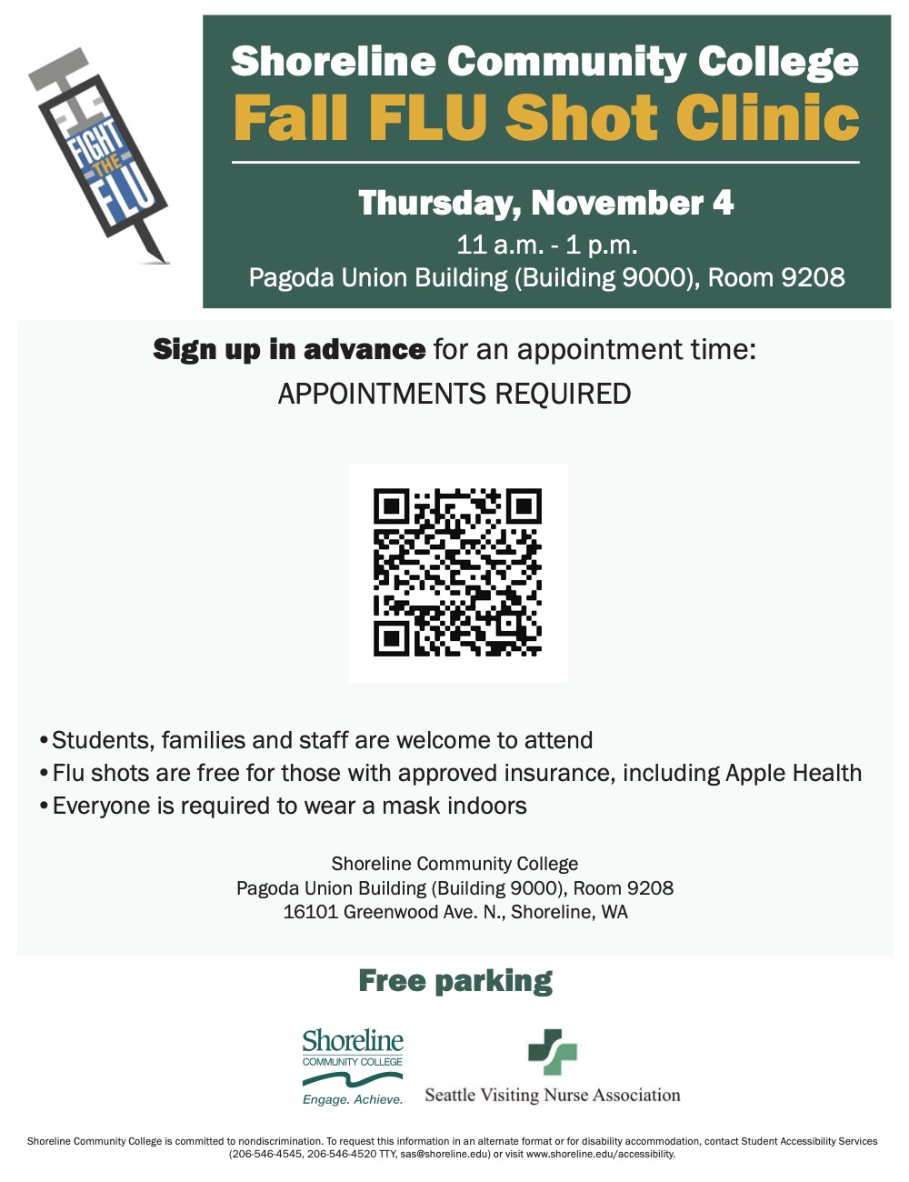 - Flu Vaccine Pop-Up Clinic, Thursday, November 4th from 11:00am – 1:00pm in the PUB (9000 Building), Room 9208 (Quiet Dining Room). Sign up in advance online. Students, family and staff are welcome to attend. Flu shots are free for those with approved insurance, including Apple Health. Masks are required indoors.