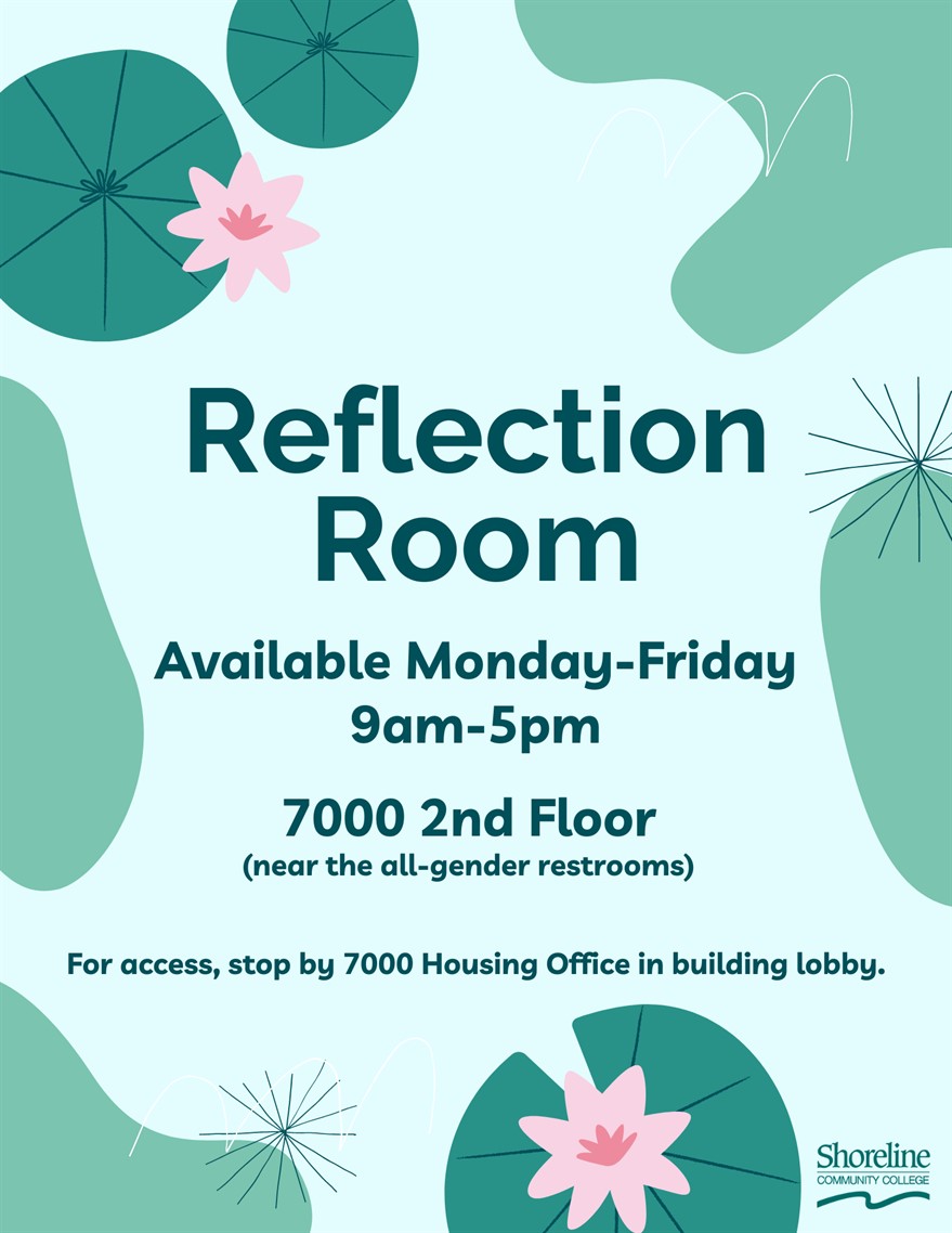 A reflection room is available to all students, faculty, and staff for quiet prayer and/or meditation. This space is located in the 7000 building on the 2nd (main) floor, down the hall from the all-gender restrooms. The reflection room is available Mondays-Fridays from 9am-5pm. For access, stop by the housing office (located next to the lobby). If you have any questions, please e-mail reslife@shoreline.edu.
