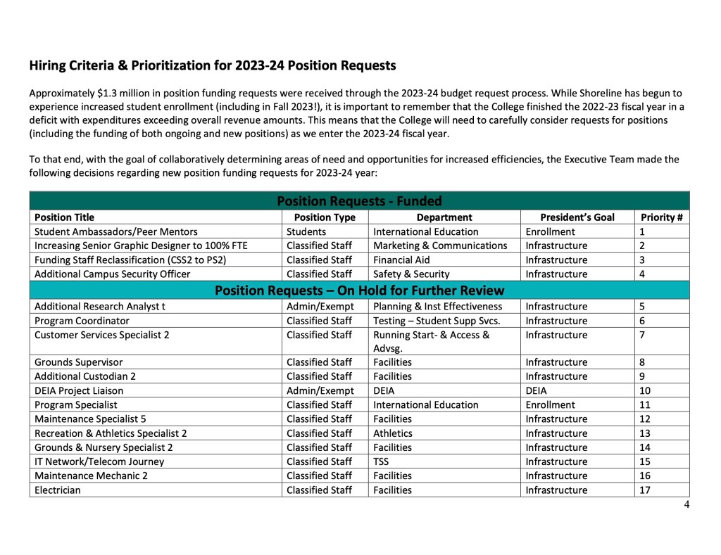 While the positions listed above are on hold for now, it is possible that new funding could be identified to bring them back into active recruitment status this year. The Executive Team will work with me to establish a prioritization list to help make those decisions based on further discussions within the impacted units and our representative leadership groups.
