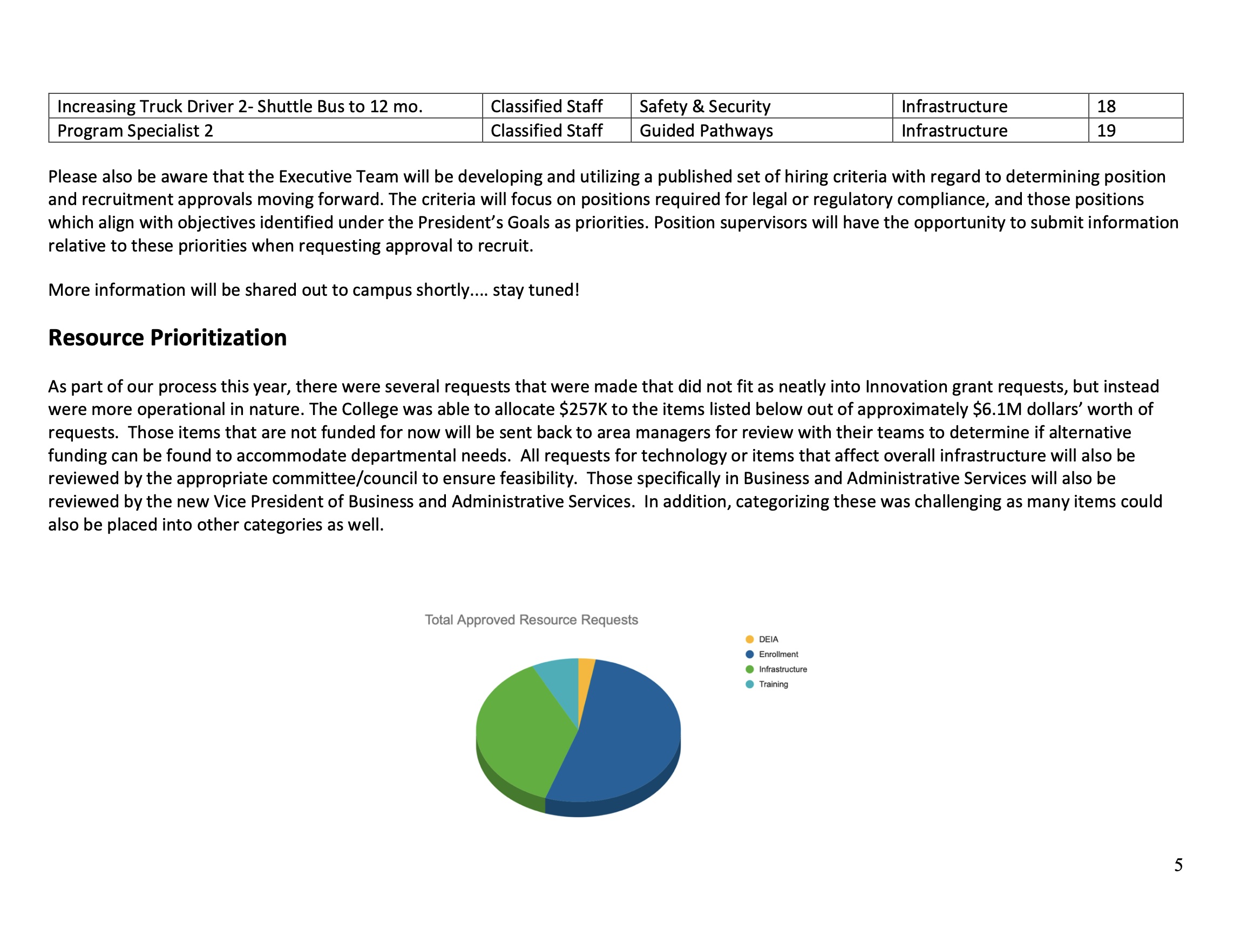 In looking for a solution to this challenge, our top priority was to ensure all currently filled permanent positions remained untouched. Instead, we looked at vacant positions to identify those that could be put on hold to generate the funds needed for a potential return to the State. An additional consideration was whether the positions were new (rather than replacing a prior person), whether the unit had begun the recruitment process, and the overall impact to the college.