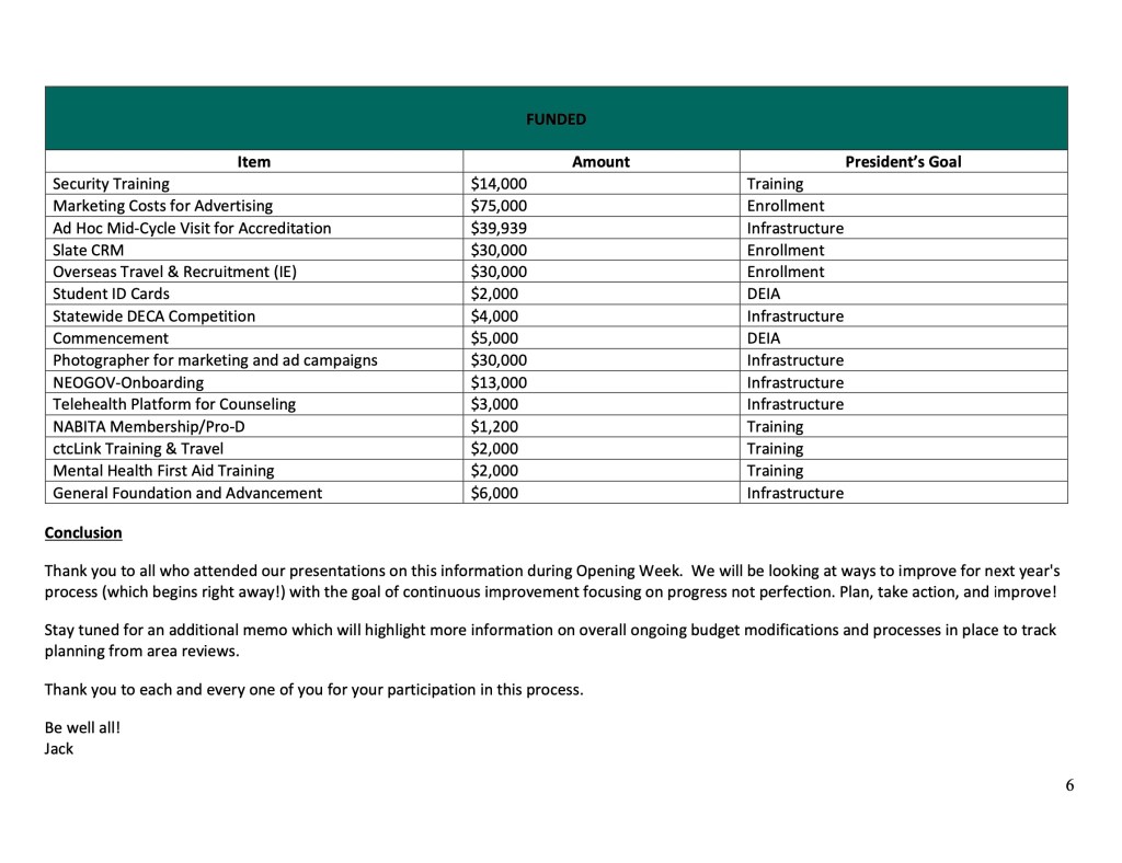 I know this is not the way that we had hoped to begin our 2024-25 academic year, but I do want to take this opportunity to thank the union leadership and Executive Team members for their thoughtful feedback and engagement during this difficult process. As stated, I am dedicated to preserving our workforce and finding collaborative solutions. I appreciate your patience and commitment as we work through these challenges together, and I will continue to share updates as they become available.