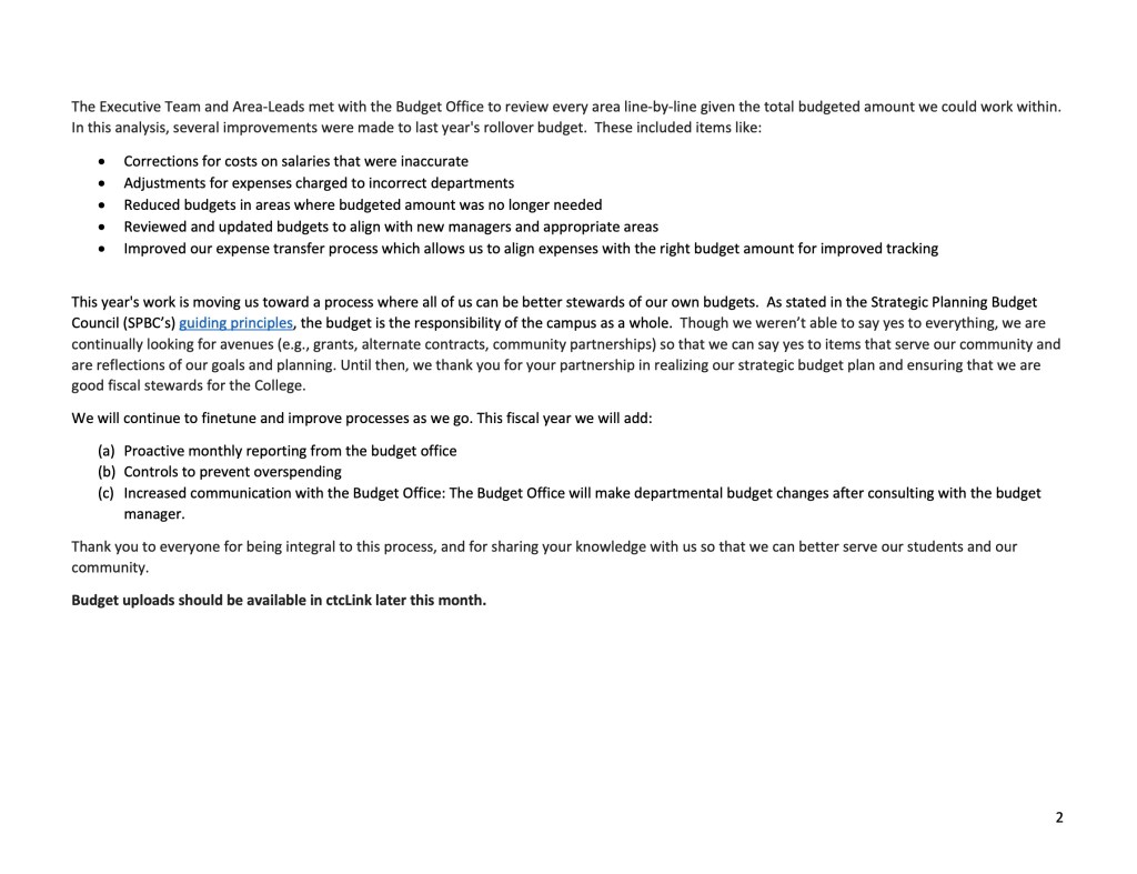 At a state-wide level, CTC presidents will continue to work with the State Board, OFM, legislators, and other stakeholders on long-term solutions. Meetings with budget leaders and legislators are already scheduled, and we are pursuing options for the next legislative session in January. I should have an update on state-level solutions in the next couple of weeks and will put all updates in my weekly email to campus as new information is available, should you wish to track that progress.