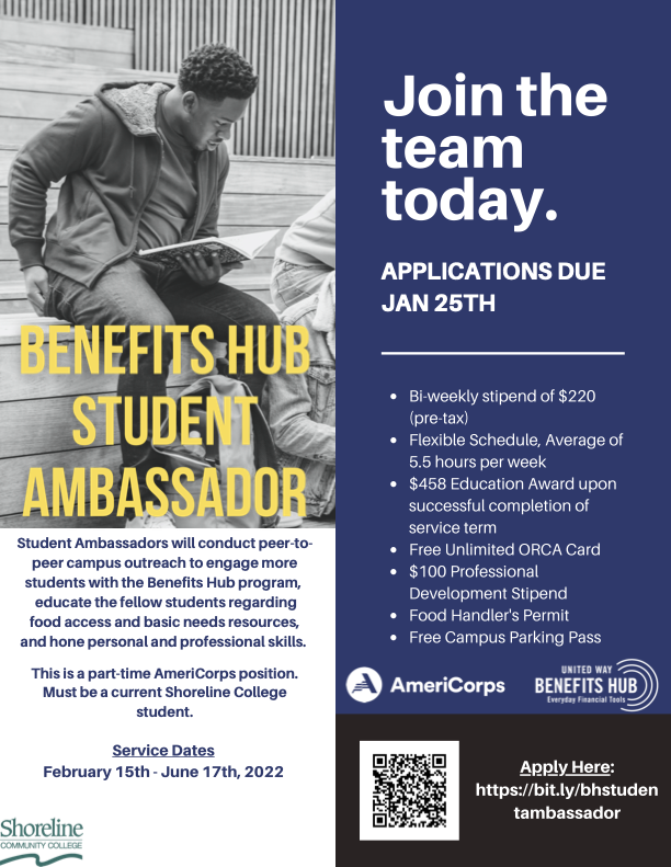 Join the team today! Applications are open! Student Ambassadors will conduct peer-to-peer campus outreach to engage more students with the Benefits Hub program, educate fellow students regarding food access and basic needs resources, and hone personal and professional skills. This is a part-time AmeriCorps position. Must be a current Shoreline College Student.