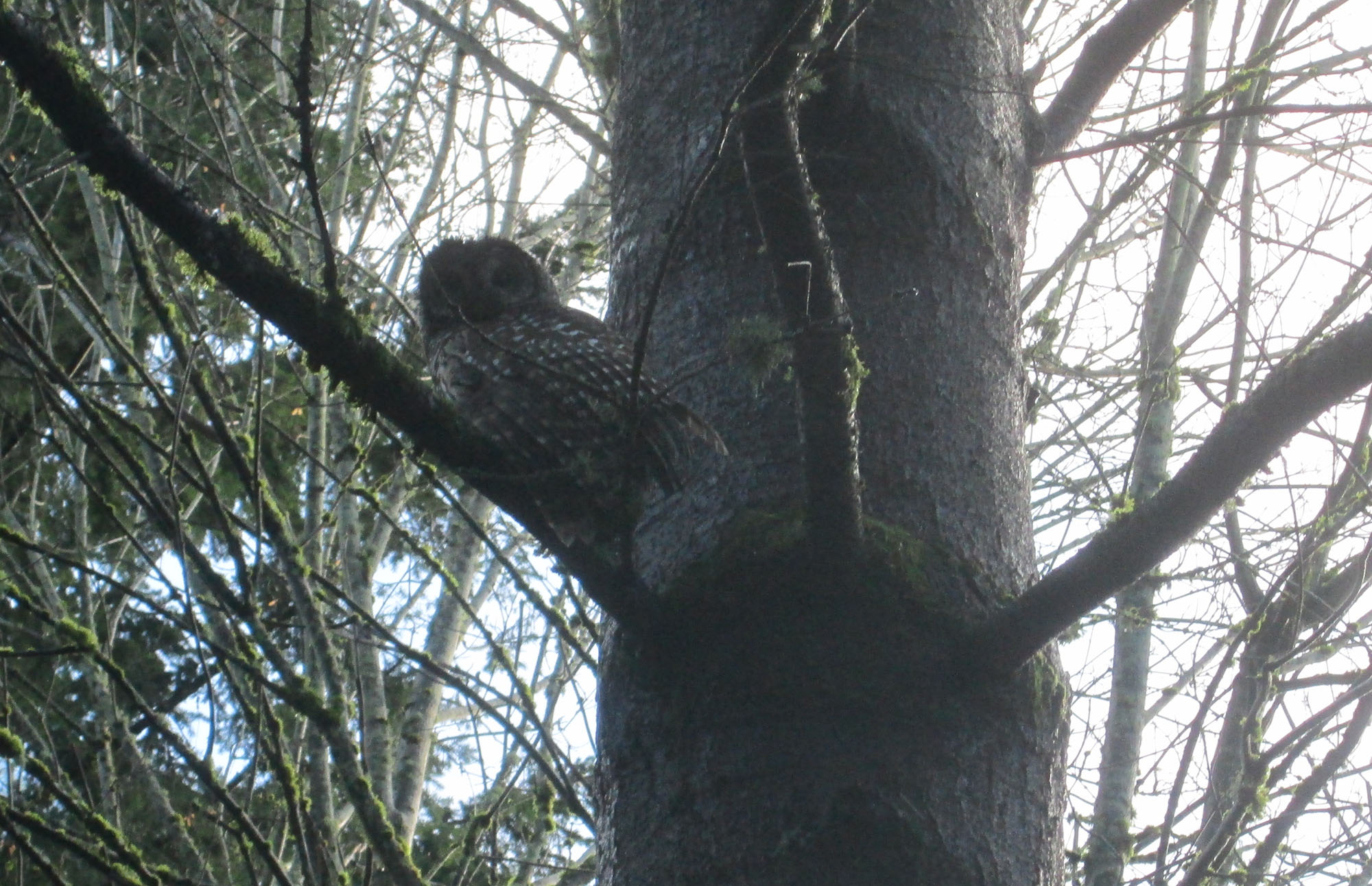 Duck! We have a new feathered friend on campus — a barred owl (we think) who’s taken up residence in the trees near the music building. It’s made its presence known by occasionally swooping through that area, and though it hasn’t appeared aggressive it can be startling to look up and see wings approaching.